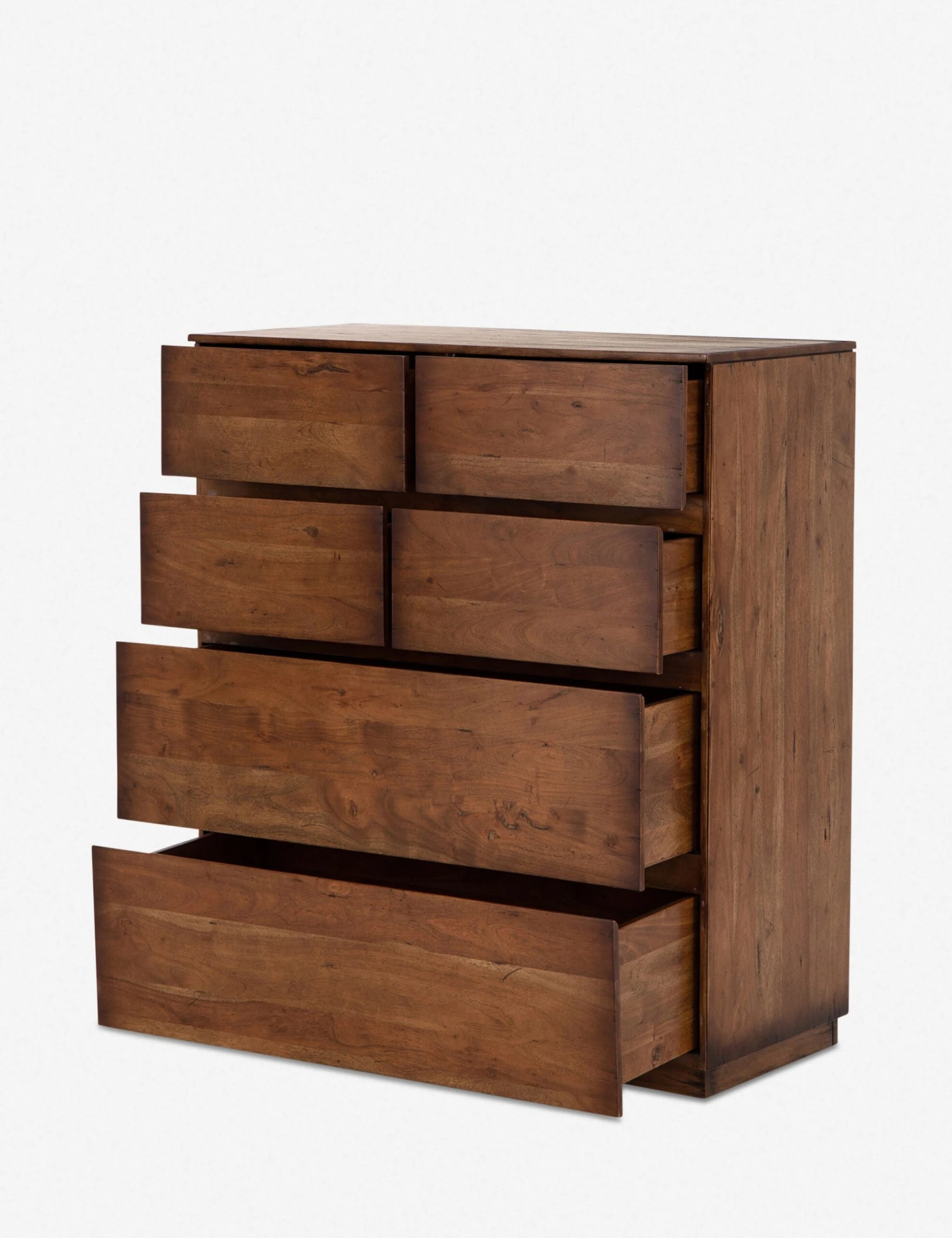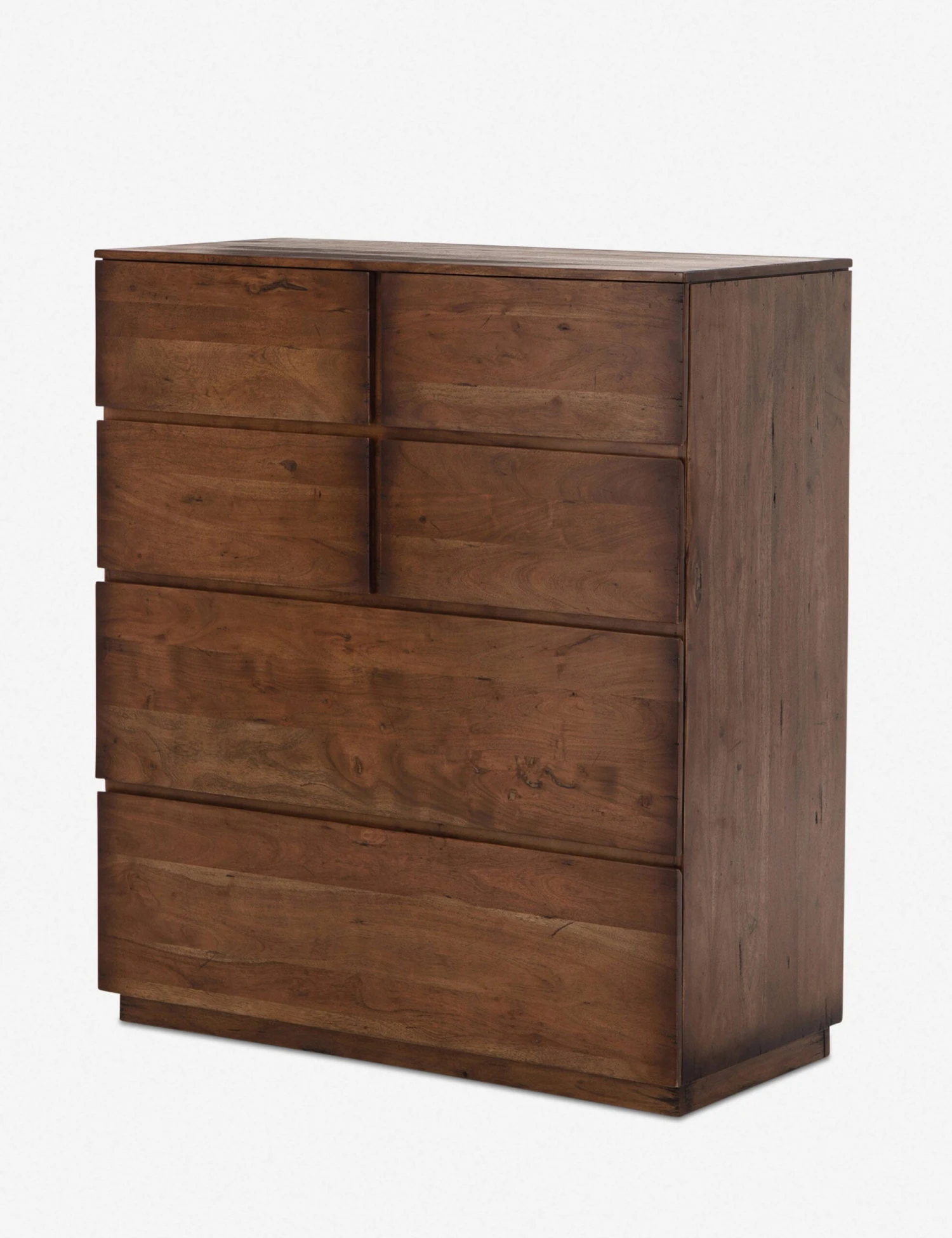 Fashioned from solid acacia wood, this dresser’s natural knots and graining offer a rich organic texture. A warm finish displays mid-century undertones and augments the knots and graining for a distinctively found feel. This tall design offers spacious six-drawer storage with a compact footprint.