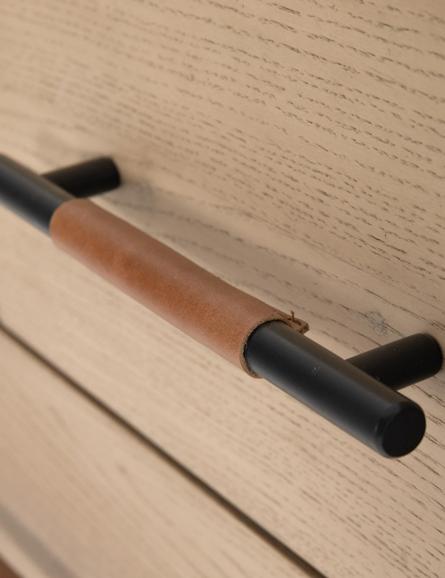 With its clean lines, sandy finish, and leather accents, this tall dresser brings a refined, minimalist effect to your bedroom. Constructed from solid oak and an oak veneer, it’s complemented by iron hardware and wrapped in tan top-grain leather. Six roomy drawers provide tons of storage space.