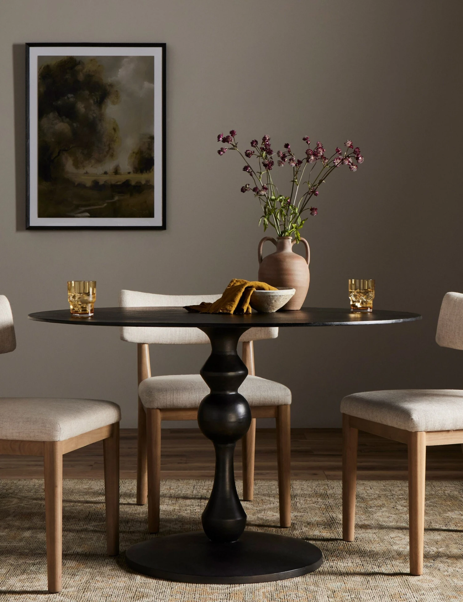 Barre is a classic bistro table that styles with effortless charm. The round top sits on a shaped pedestal base in black for vintage appeal with a modern edge. We love this chic look for a sunlit dinette or offering a casual air as an eat-in kitchen table.