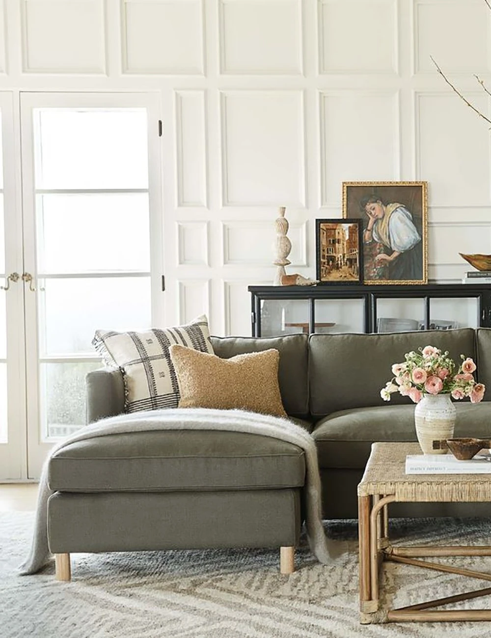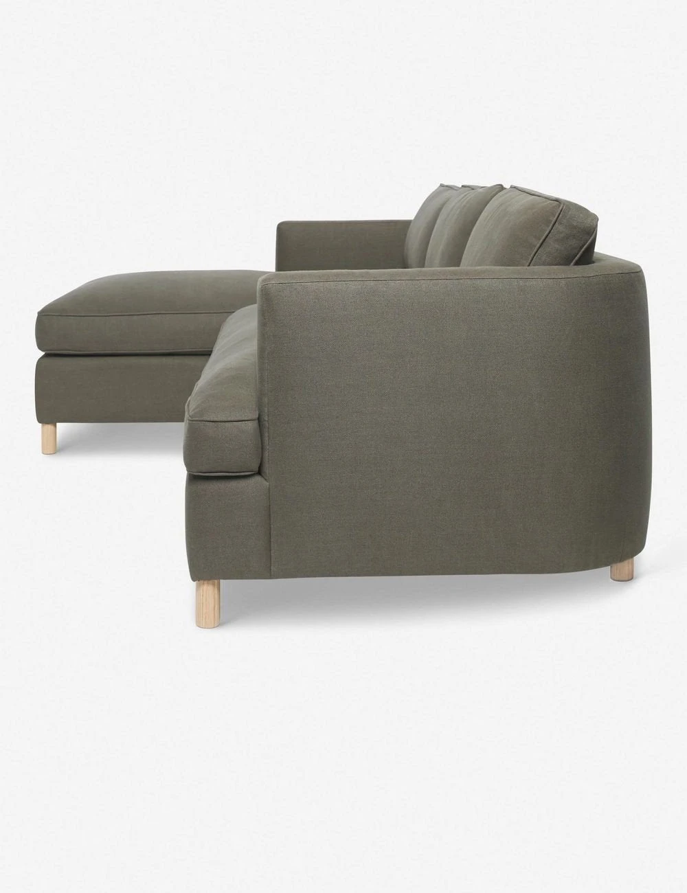 From the exclusive Ginny Macdonald collection for Lulu and Georgia, this classic sectional sofa features a curved back and plush, oversized cushions to bring a polished yet transitional look to your living room seating. Inspired by Ginny’s English heritage and handmade in Los Angeles, the collection fuses her British roots with her California lifestyle. This comfortable sectional is available in a variety of fabrics and colors, making it the perfect mix-and-match piece.