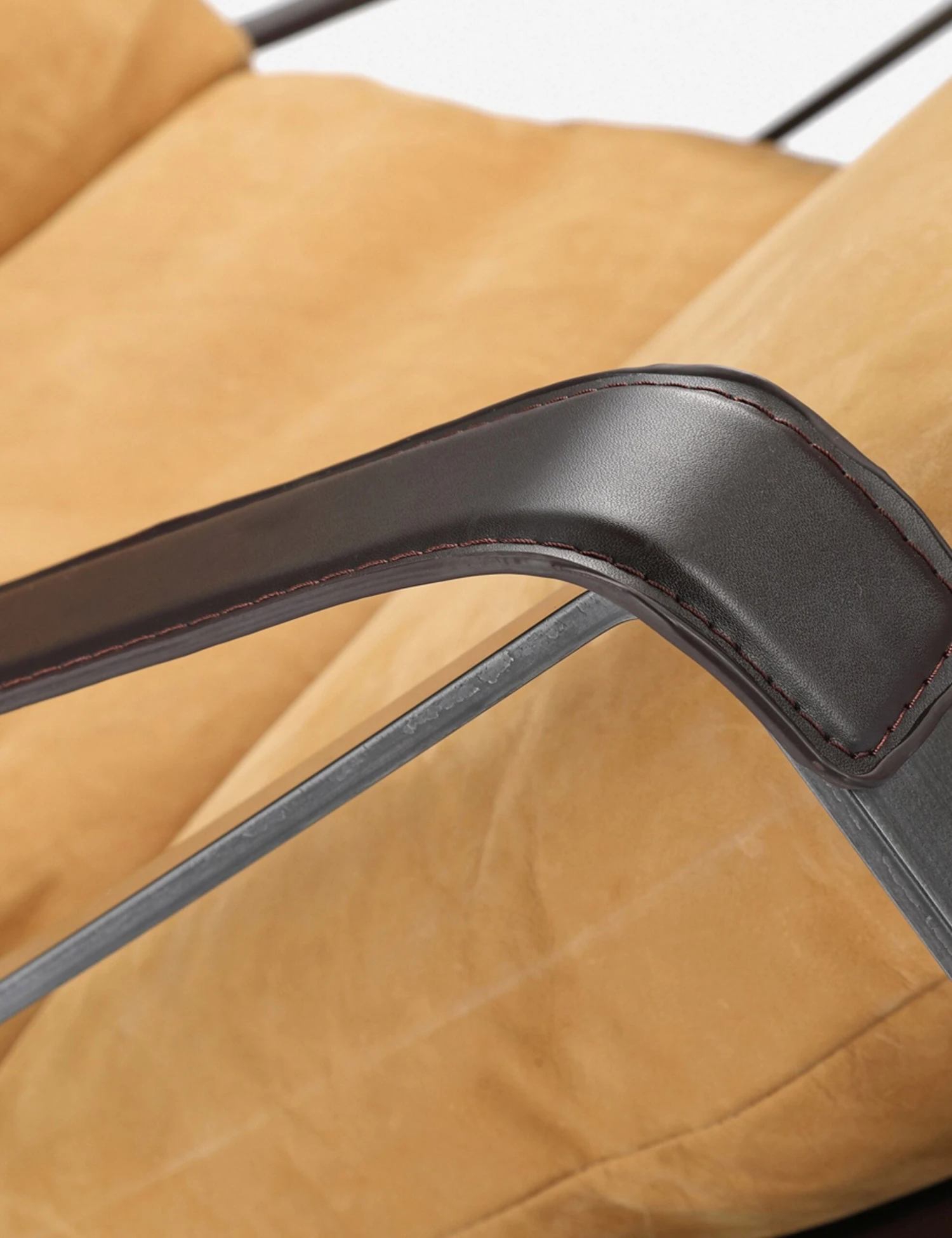 The Bo chair is the perfect blend of hard and soft, angular and curved. A square metal frame cradles arms crafted from top-grain leather and a slouchy cushion with a relaxed, lived-in feel.