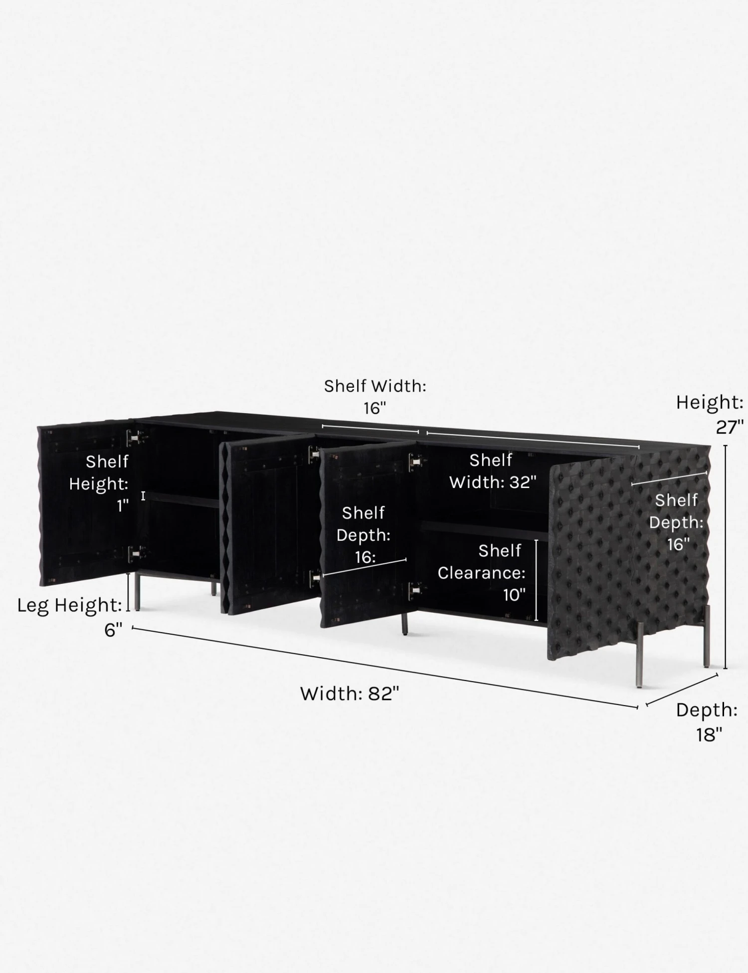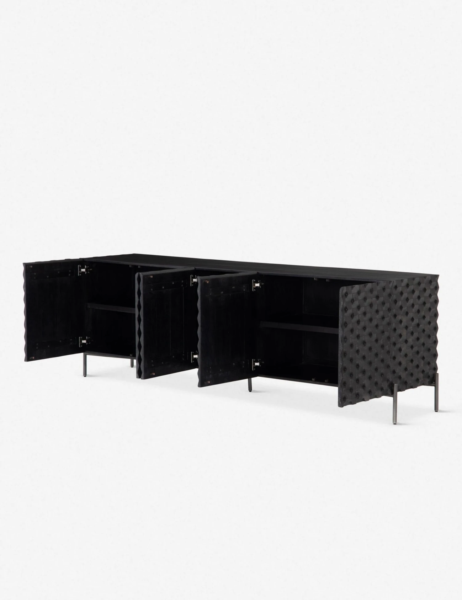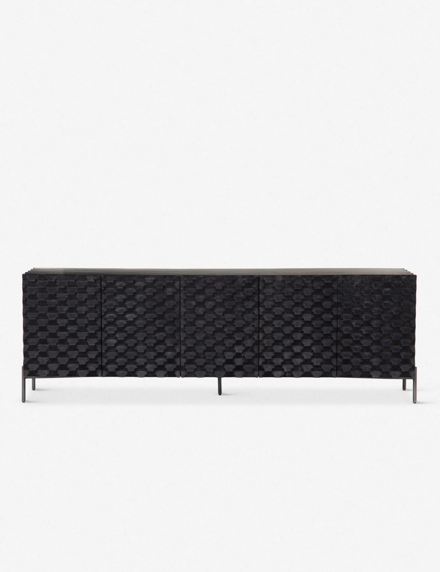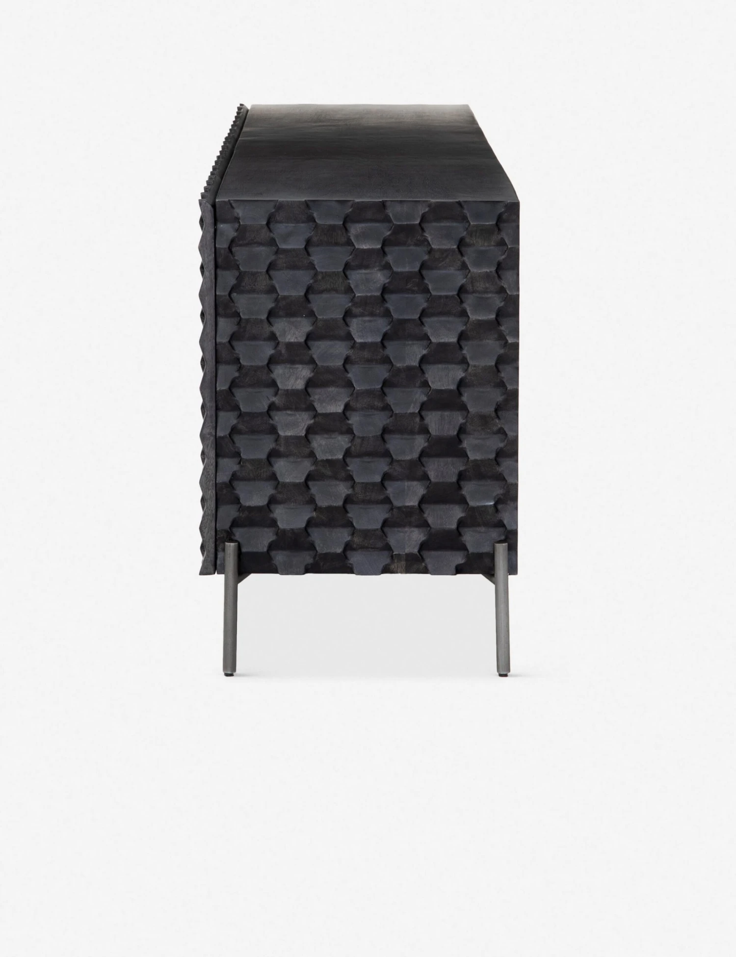 A truly modern piece that will be the focal point of your media room, this wooden console’s unique carved design adds geometric texture in a sleek black wash. Sits on a minimalist iron base.