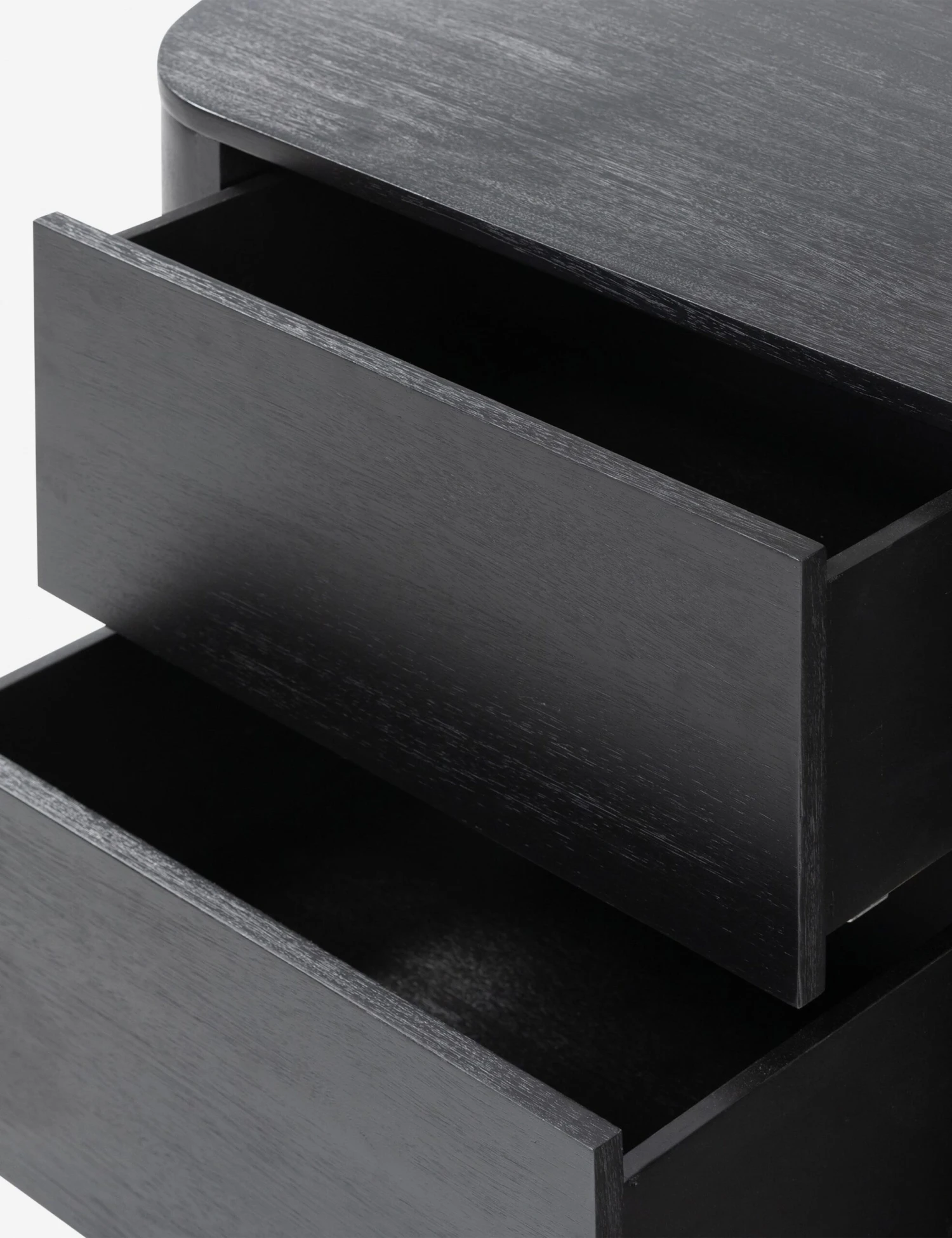 Clad in acacia, the soft lines of this nightstand are reflected in the plinth base to offer a sturdy design with a gently rounded profile that feels sculptural yet grounded. This modern nightstand features two deep drawers with soft-close slides, offering an elegant touch of bedside storage.
