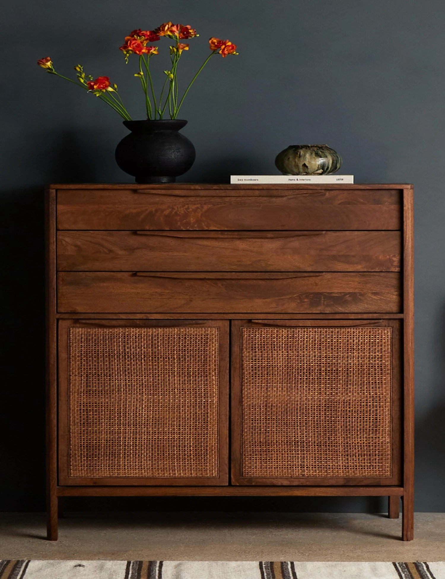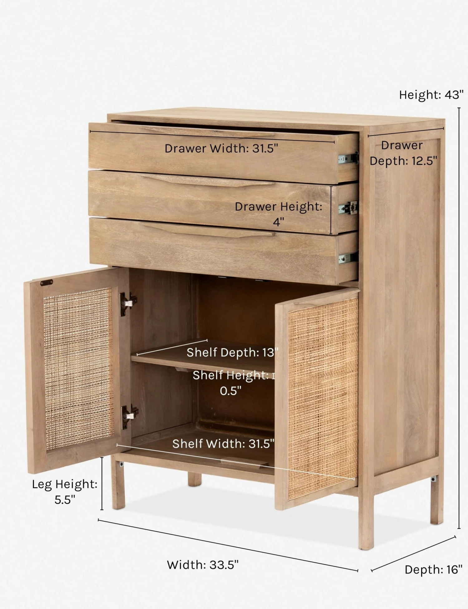 Clean lines and an airy profile bring a cool coastal feel to the Hannah dresser. We love the classic touch of the woven cane front for its natural texture and warmth. This tall dresser features three drawers with cabinet doors below—versatile storage for a bedroom or home office.
