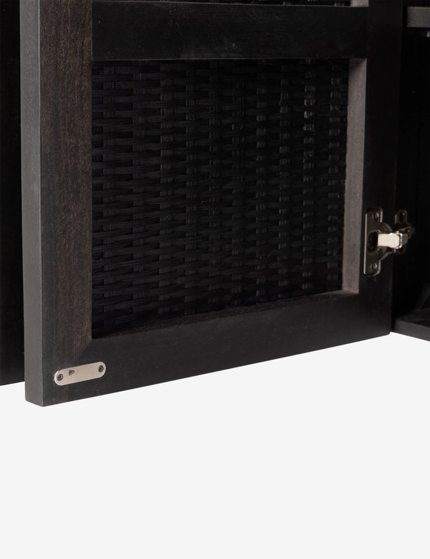 The Isaura sideboard offers textural impact in black. Its cane-paneled doors open to spacious shelving for dishes, linens, and other household essentials. The dowel legs stand apart from the case, framing this sideboard cabinet with an artful bearing.