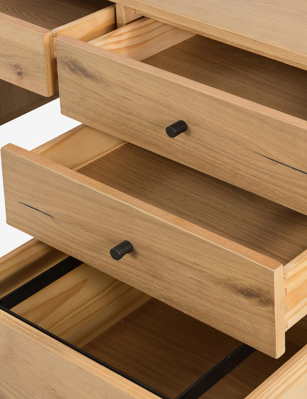 Pairing ultra-slim iron legs with a light-finished thick oak veneer, this modern desk offers mixed-material appeal in a streamlined silhouette. This desk provides ample storage in a clean, minimalist design featuring a spacious cabinet and four drawers.