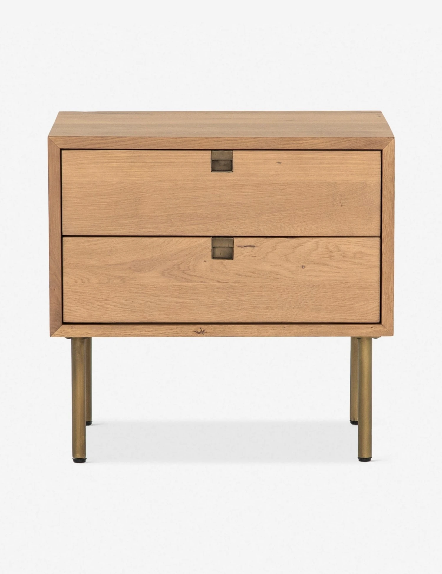 Combining streamlined design and retro details, the Karma collection is ideal for modern spaces. This nightstand features cutout details, natural oak variations and thin brass legs.