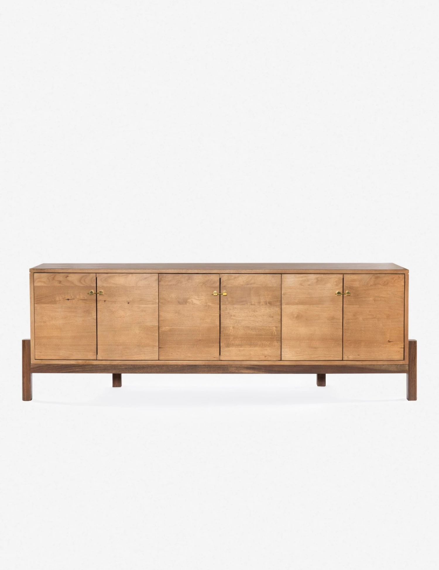 This media console table takes a statement-making approach to organic, natural materials. With contrasting legs for a floating look, sleek brass hardware on all six doors, and media cutouts, it’s a perfect fit for your modern living room.