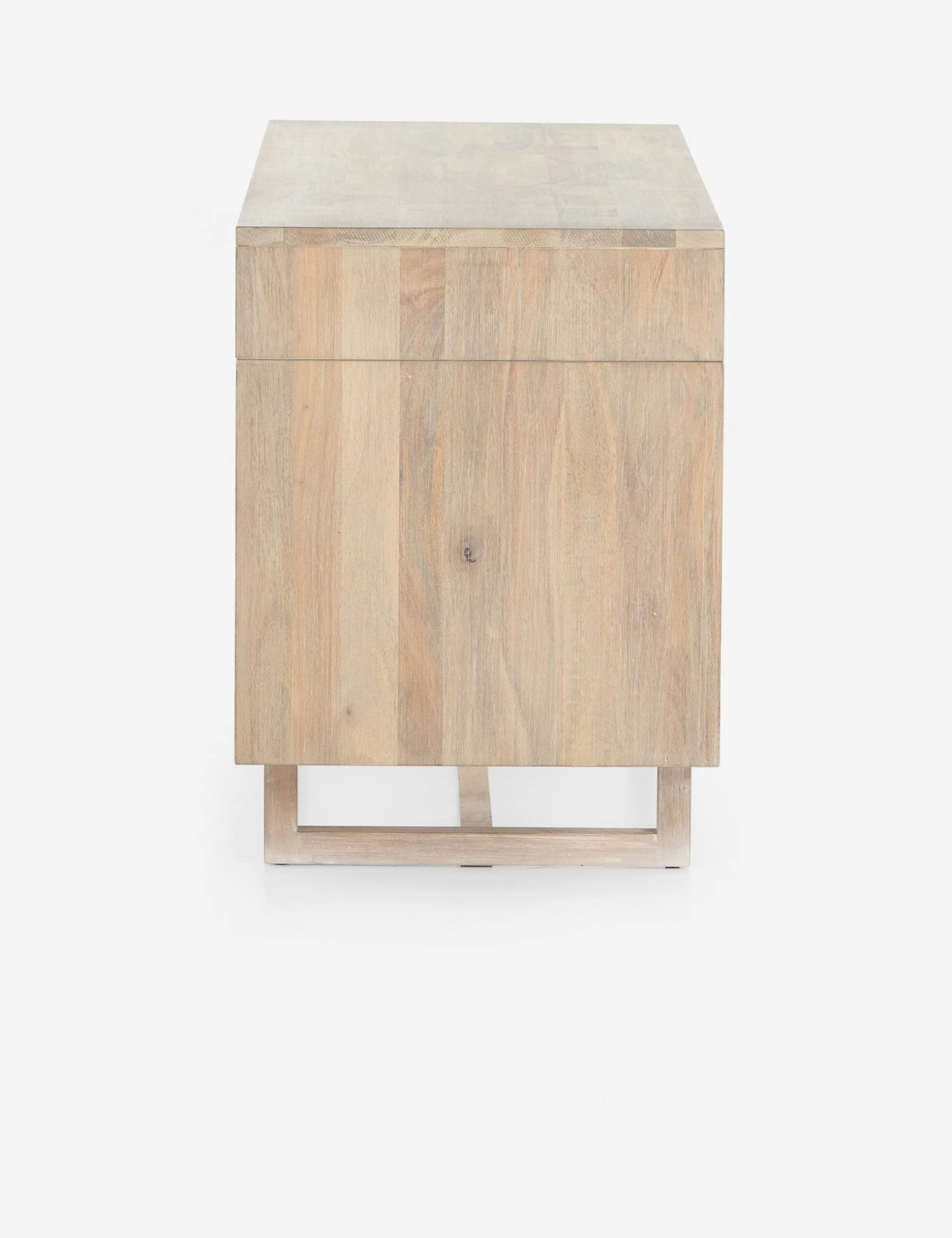 A timeless, clean-lined silhouette is elevated by detail-rich wood grain and woven cane fronts to create this Margot Desk. Crafted from natural mango wood, its whitewashed finish complements the three cane pencil drawers and a cabinet door for a tonal storage piece. Immediately transform your home office with this workstation.