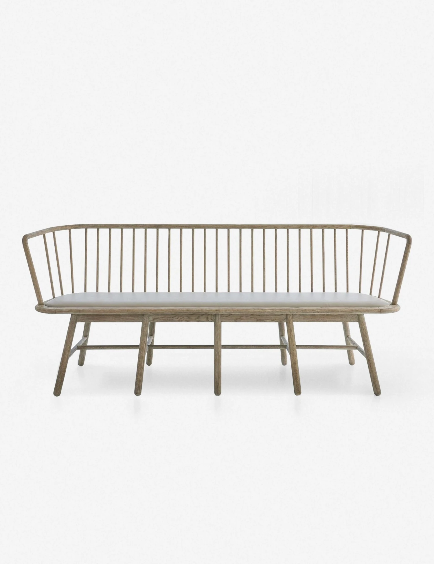 A bold take on traditional Shaker style, this wooden bench is designed with a curved spindle back; the pattern echoes in the grid-like wooden legs. A leather seat cushion makes this a favorite for entryways and casual living spaces.