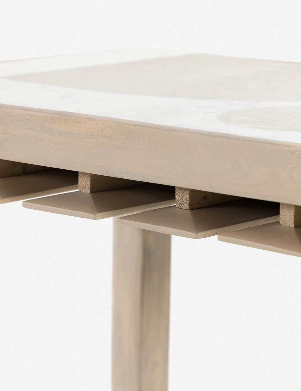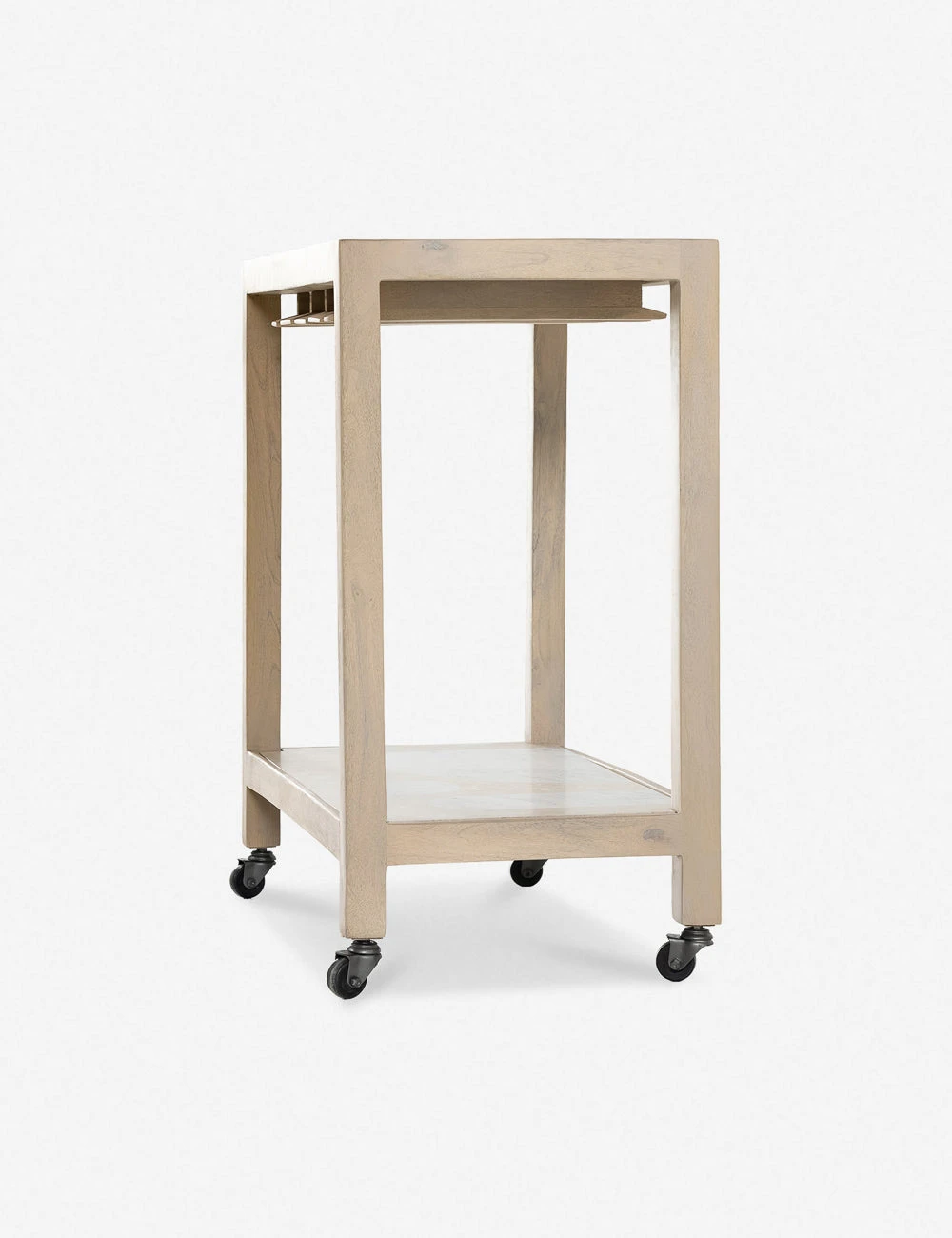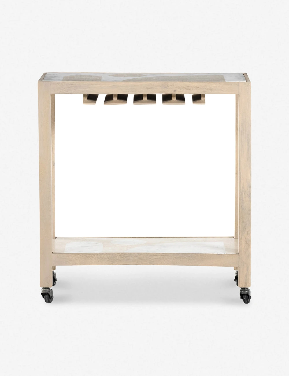 This wheeled bar cart brings a luxe touch to a lounge or open-plan space. The light-finished mango wood frame features white marble shelves with inlaid shapes for stylish intrigue. The tonal appeal of this cart looks stunning decked out in your favorite cocktail and barware essentials.