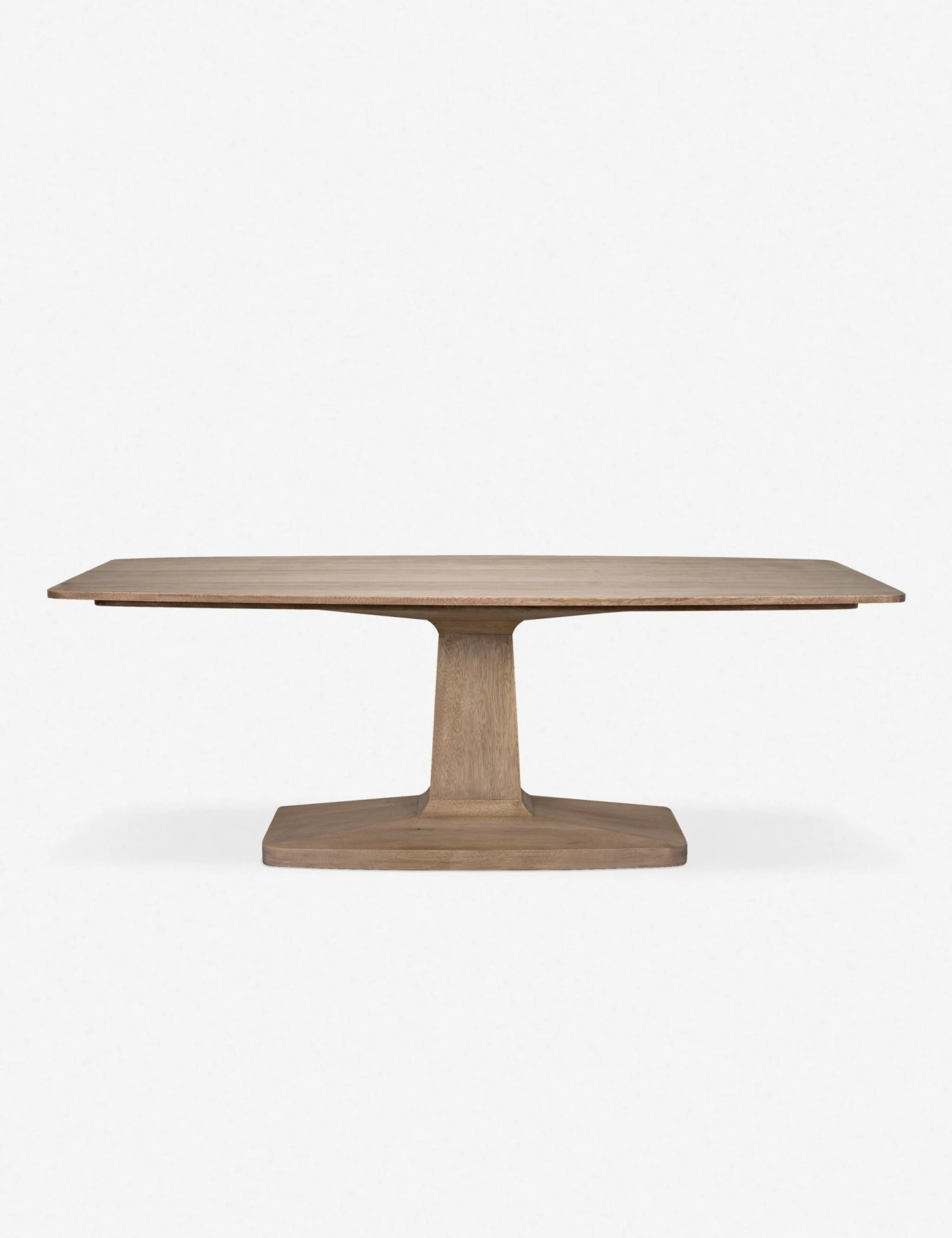 Your contemporary dining room deserves a table that lives up to your aesthetic. This rectangular table is the perfect pick, featuring tapered angles along the pedestal base, and rounded corners for a softer take. Finished in a washed walnut for a more lived-in appeal.