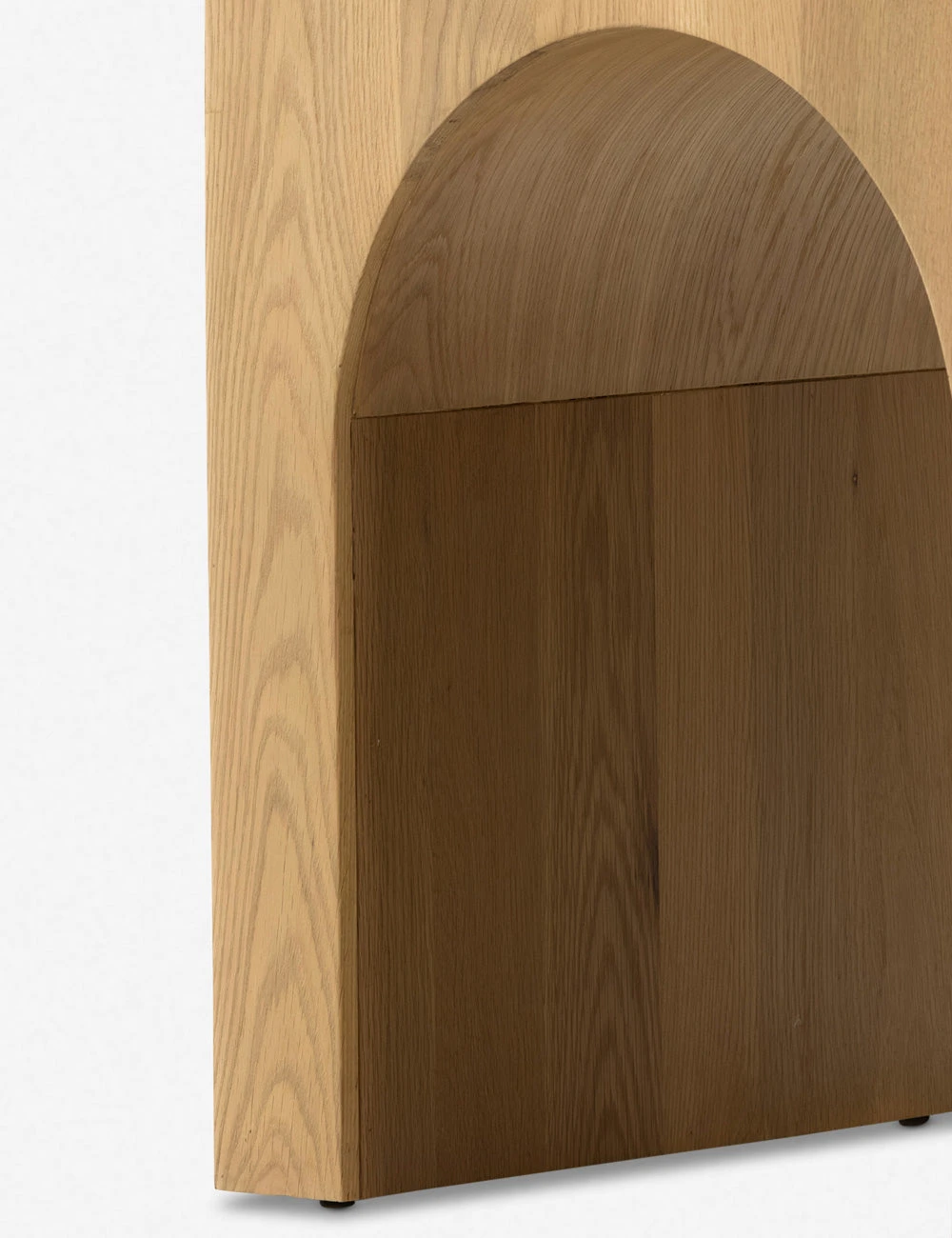 Crisp lines and an arched silhouette add architectural intrigue to this wood end table. Clad in a warm oak veneer, this side table is the perfect base for a lamp or houseplant—or can offer a sculptural yet functional touch by your bedside or sofa.