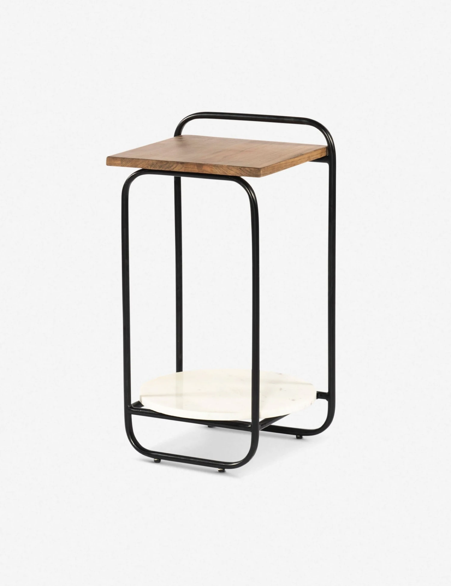 Bring a polished contrast to your living space with this mixed material side table design. A minimal black iron frame supports a carmel-colored oak top and smooth marble shelf below that can be styled as a dynamic end table or stationary bar cart for a delicate yet functional accent layer in a transitional aesthetic.