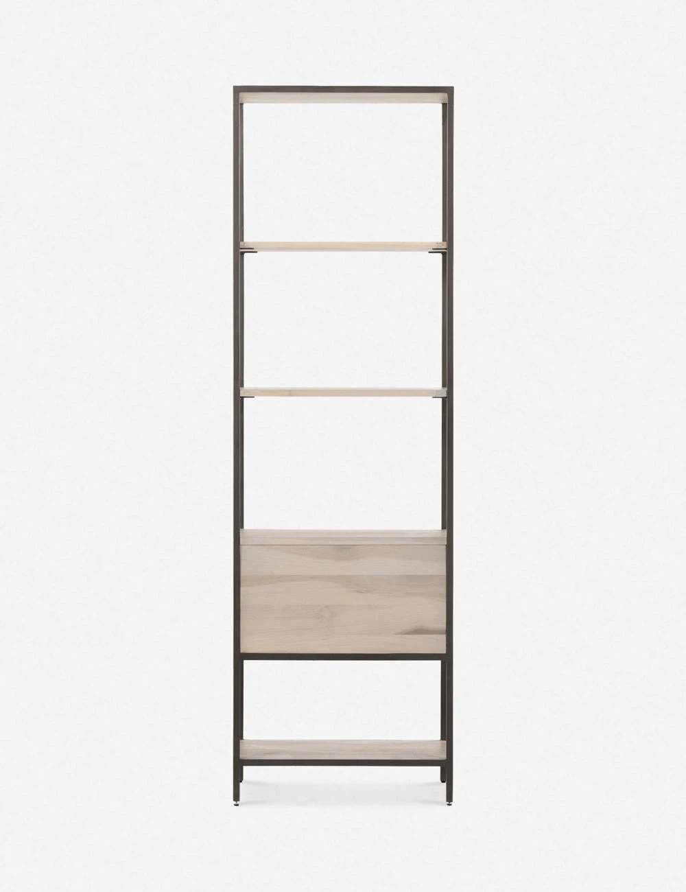Keep your style grounded (and super organized) with this tall wooden bookcase. This bookshelf features elements of mid-century aesthetics and a mixed material construction pairing solid poplar with a slim iron base and top-grain leather drawer pulls.