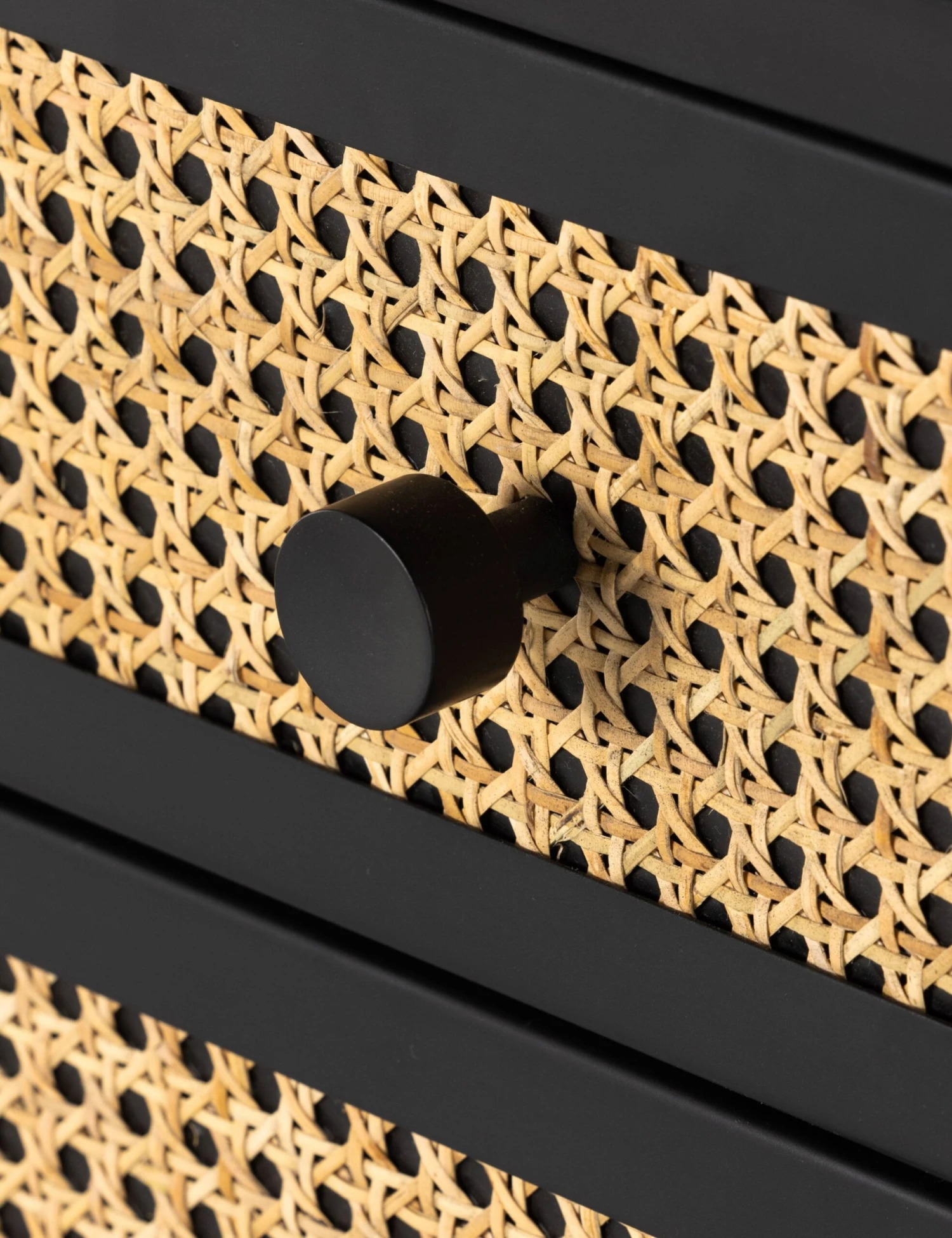 Modern charm is in the mix with this clean-framed nightstand. Natural cane paneling pops against the sleek, black iron frame in a thoughtfully balanced design. With three drawers, this bedside table offers plenty of storage with a stylish edge.