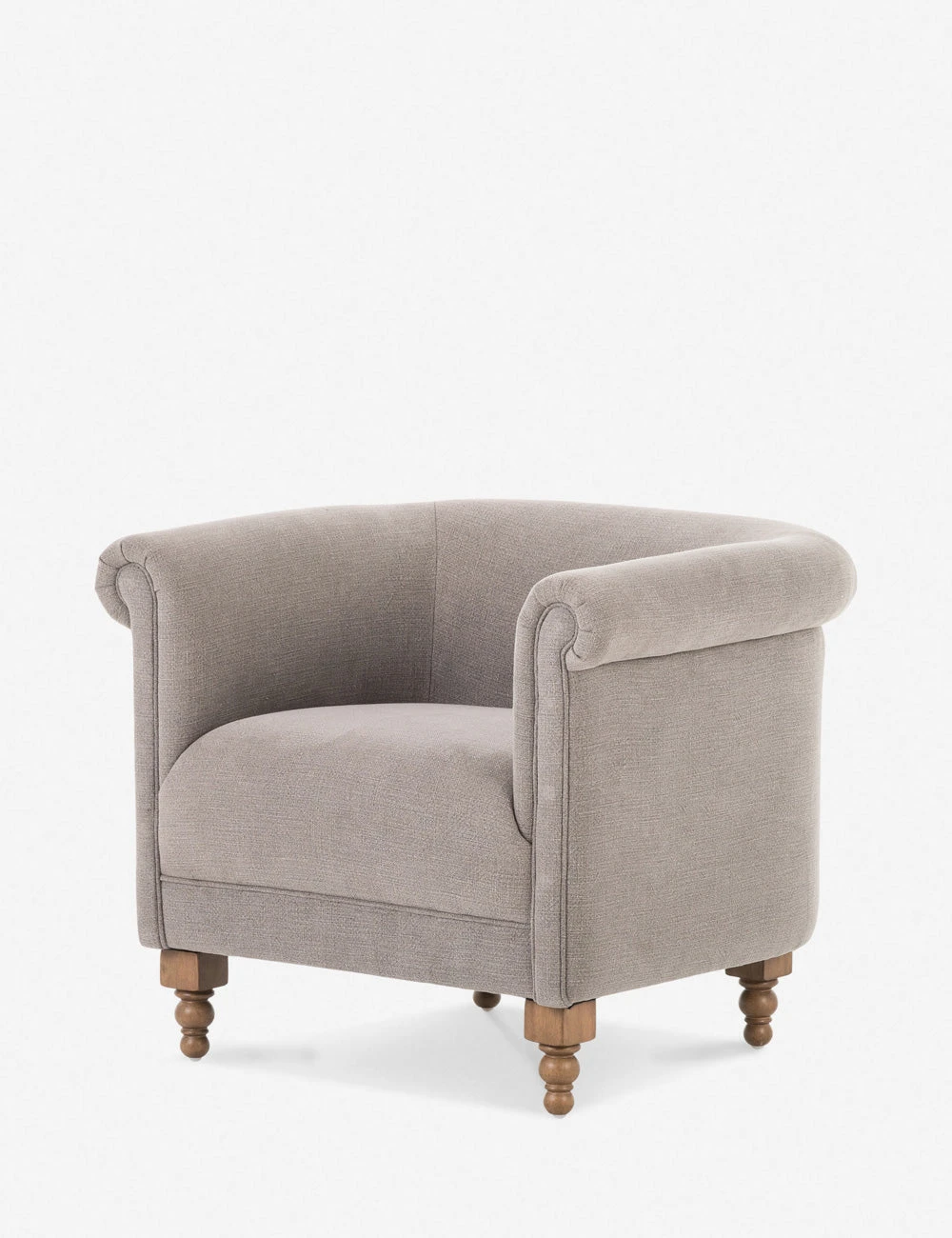 Rolled arms and a plush barrel seat pair timeless style with transitional appeal for this occasional chair. The welt cord trim and ornately styled legs offer a traditional chair design in a grounded neutral tone that can fold seamlessly into your look.