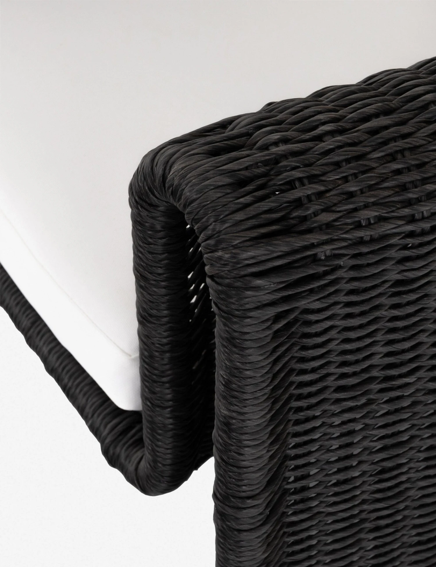 With its shapely, sling-like form, waterfall arm, and coal-colored finish, this accent chair is a nod to curvy seventies styling. Its all-weather wicker frame cradles durable tufted cushioning in a versatile white color palette. We love the idea of using this occasional chair to relax poolside, on your terrace, or even in your sunroom.
