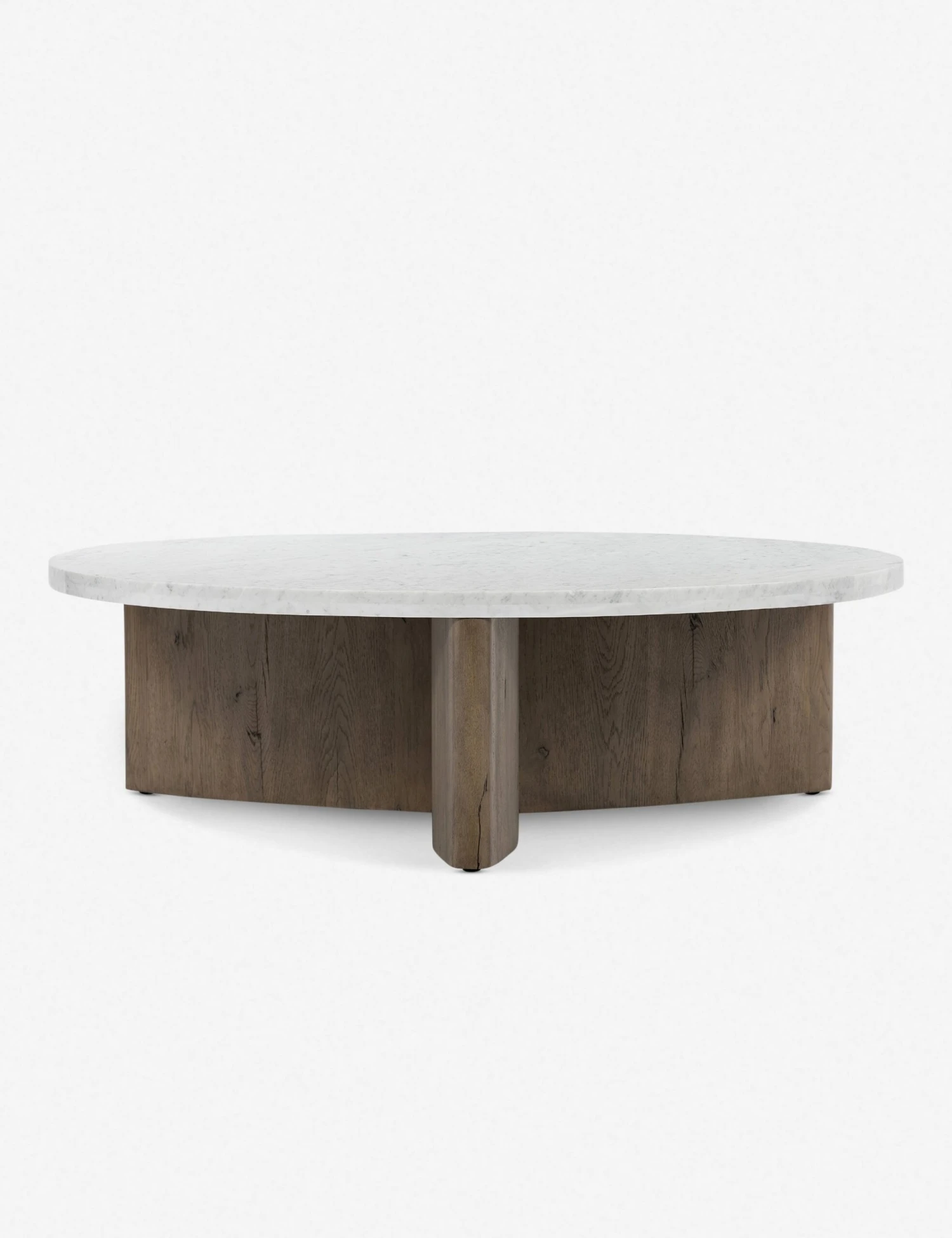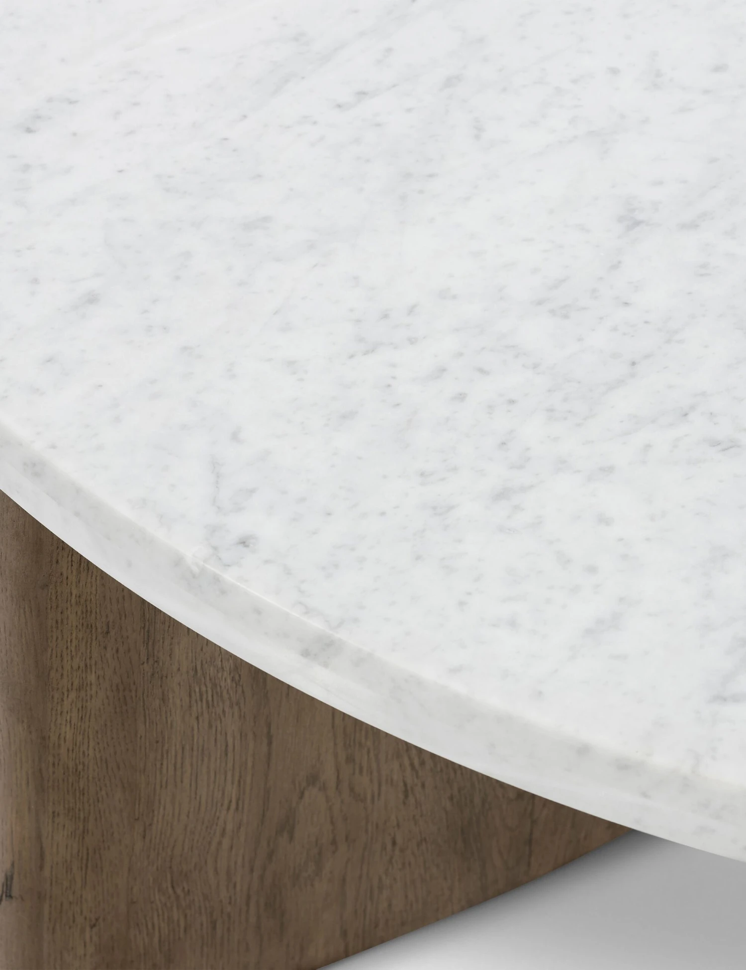 Mixed materials create polished contrast in this luxe coffee table design. Thick-cut oak forms a sculptural base topped by a round white Italian marble tabletop with beautifully subtle striations. Center your look with this middle table for elevated everyday decor.