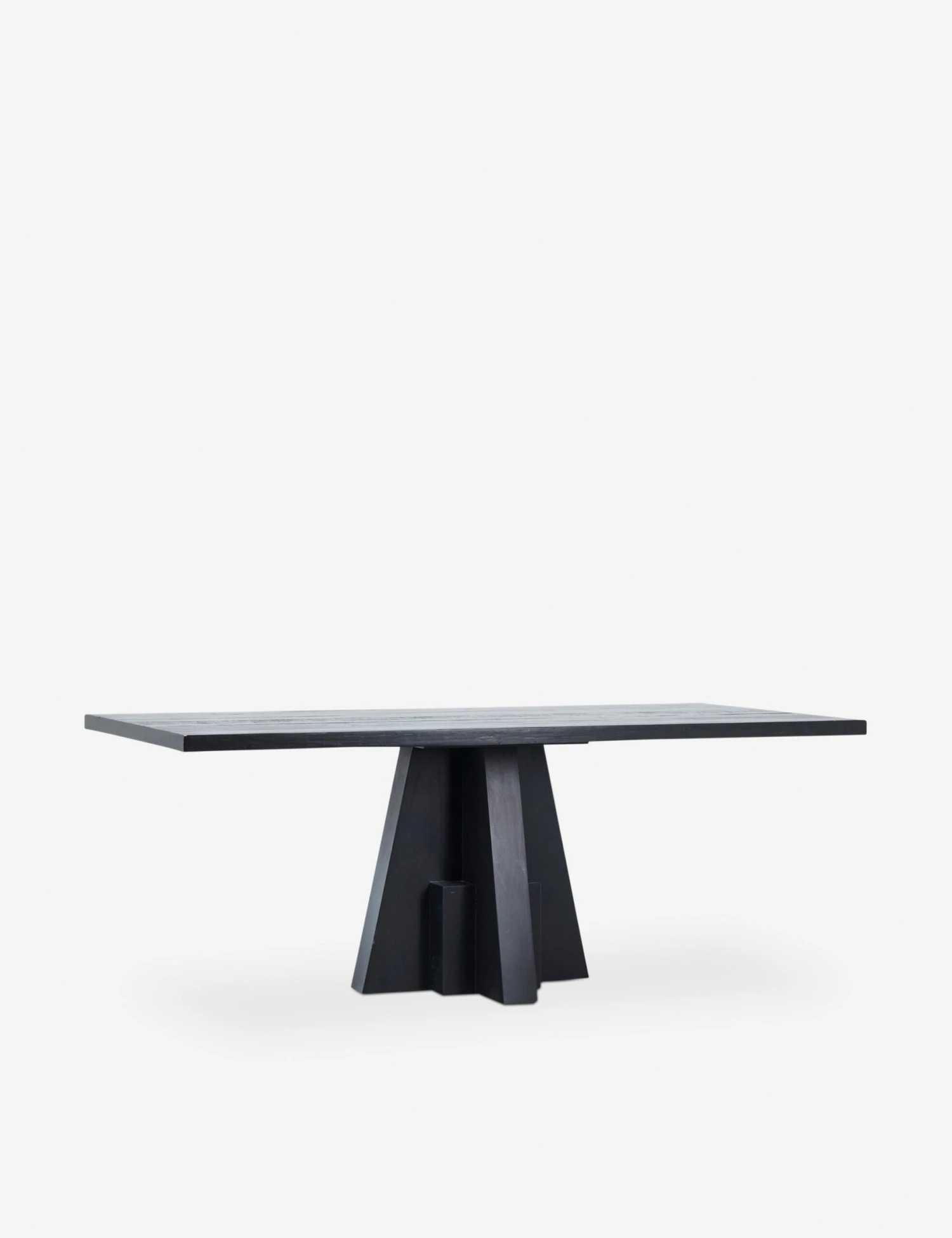 A sculptural silhouette clad in a matte black finish sets the tone for stunning impact in this unique dining room table. The pedestal base features a striking geometric design, offering deco inspiration with timeless appeal. This table is the perfect anchor for a moody aesthetic or sophisticated dining room look.