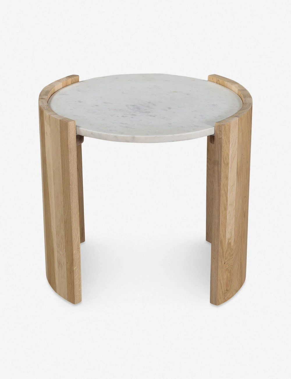 French deco notes play with raw organic tones in this modern side table design. We love how the oak legs softly frame the beautiful marble tabletop offering up a gently elevating silhouette. This stylish marble end table is perfect for a light and airy space full of refining touches.